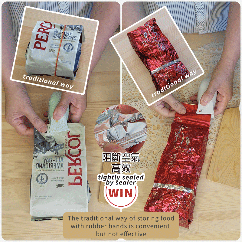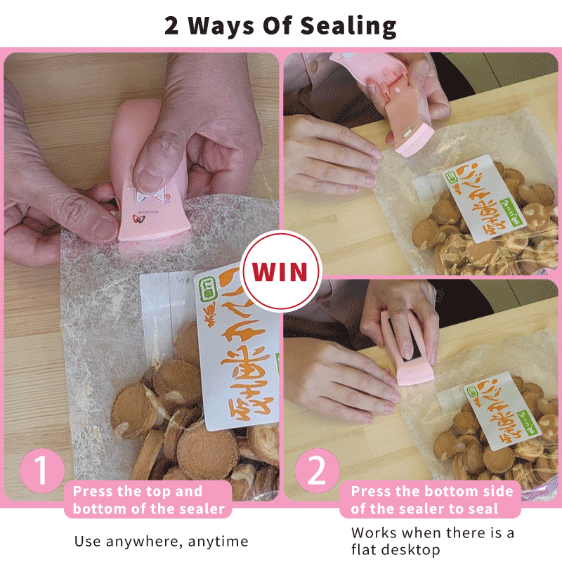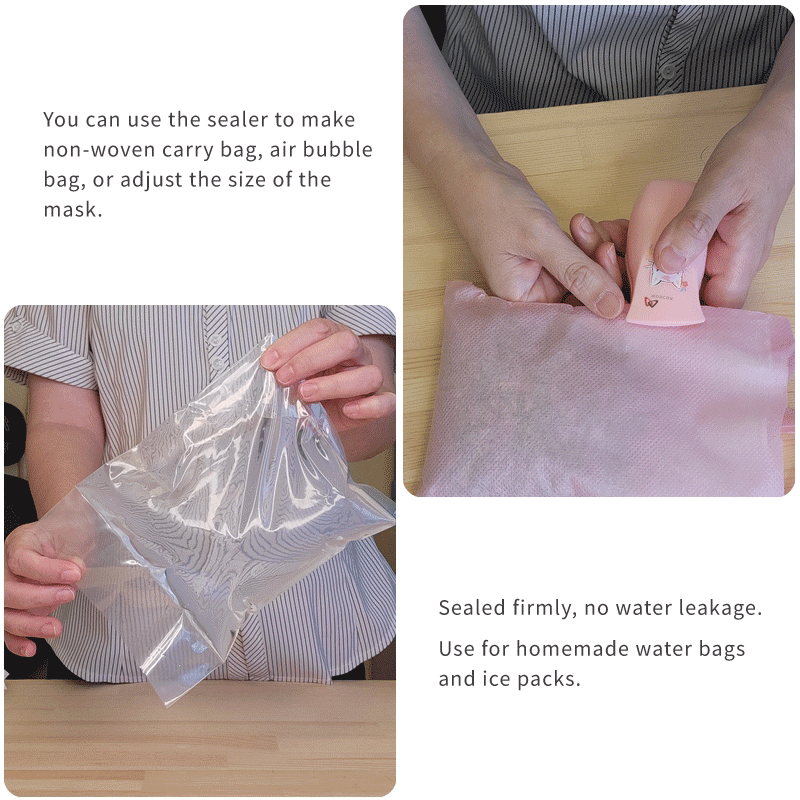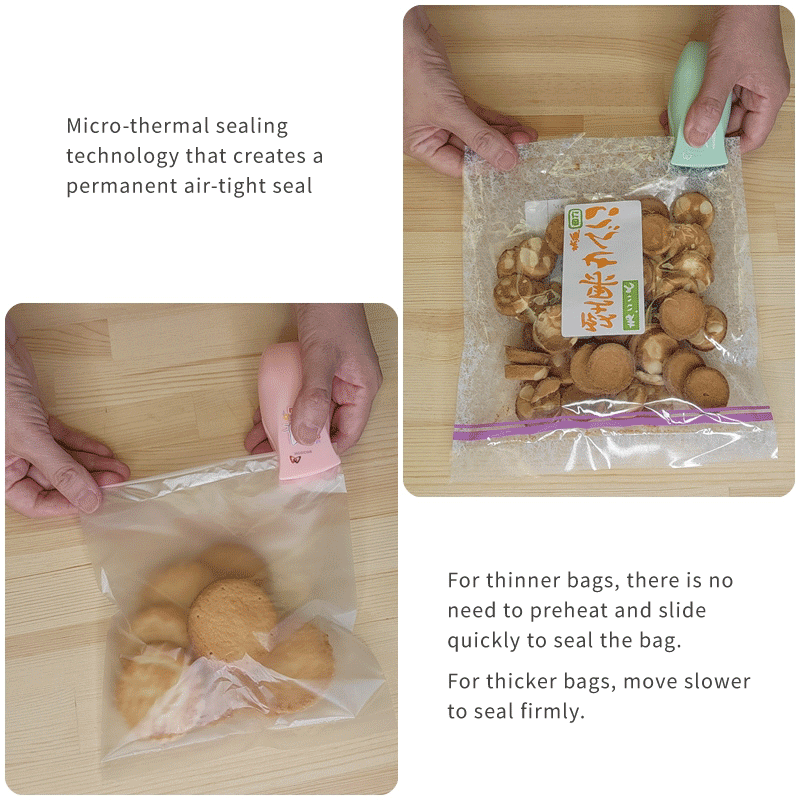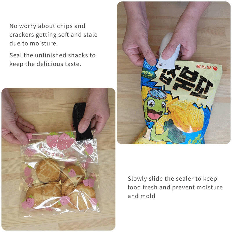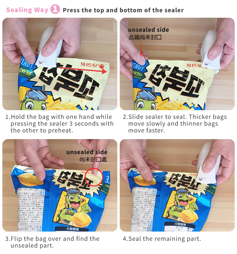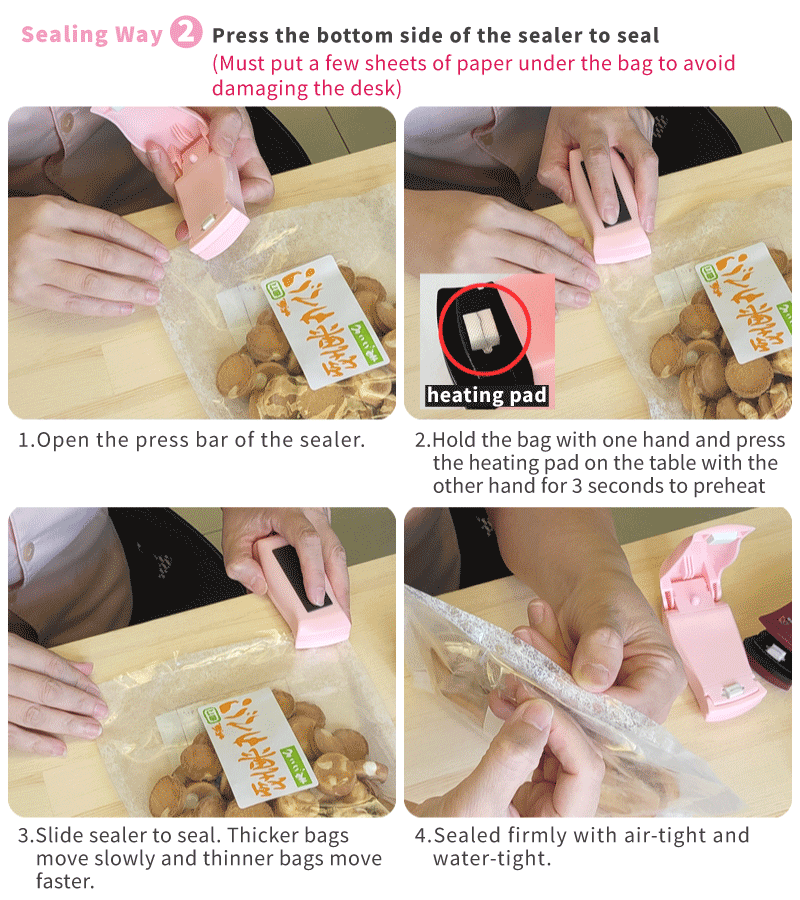 2.Please press the sealer for 3 seconds to preheat, and then move it straight to the right to seal.