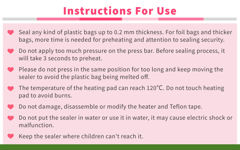 4.It is normal to produce a little smoke while sealing, you can continue to use the sealer. If the wire on the heating pad turns red, please stop sealing and wait until it cools down before use.