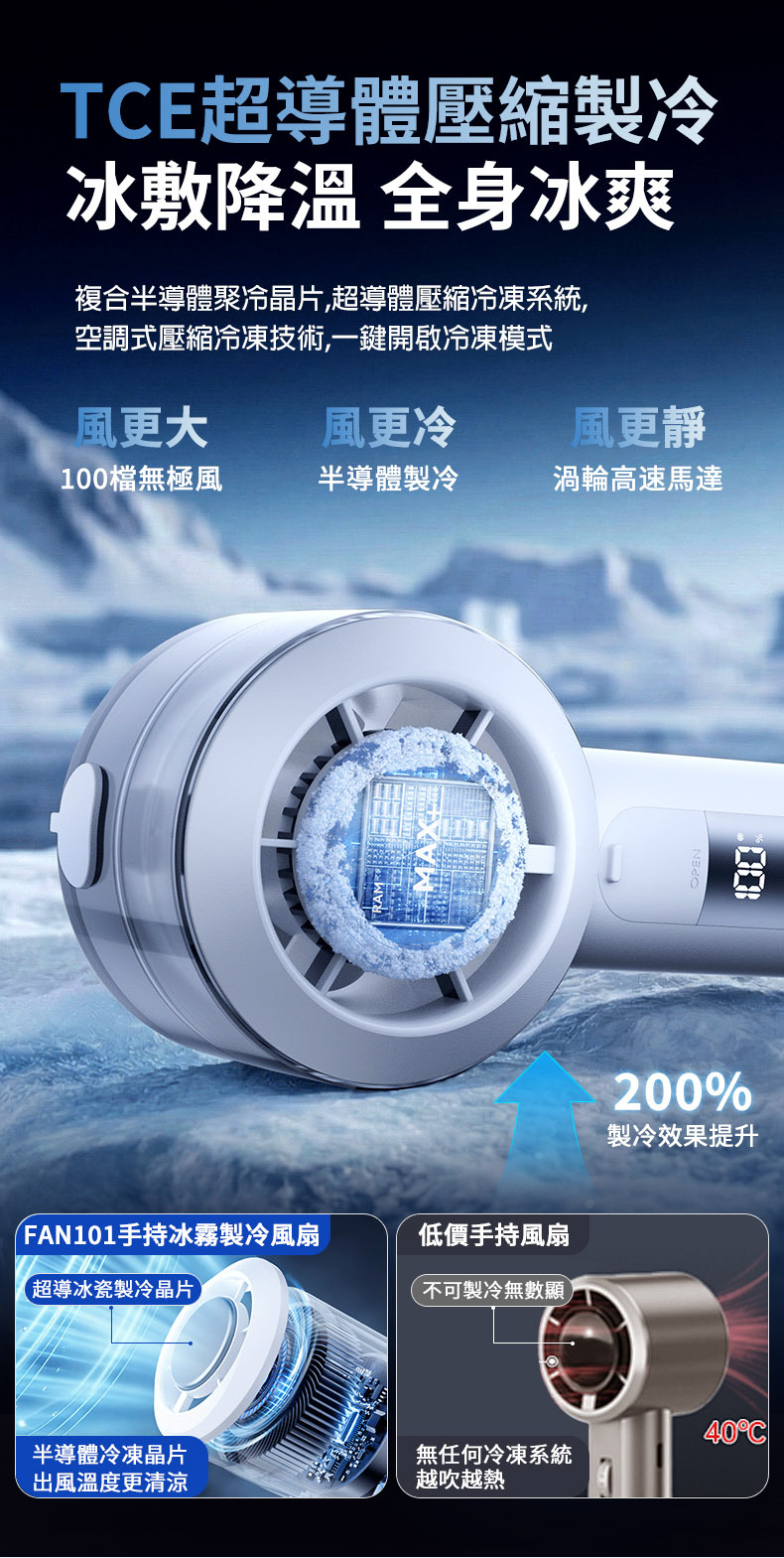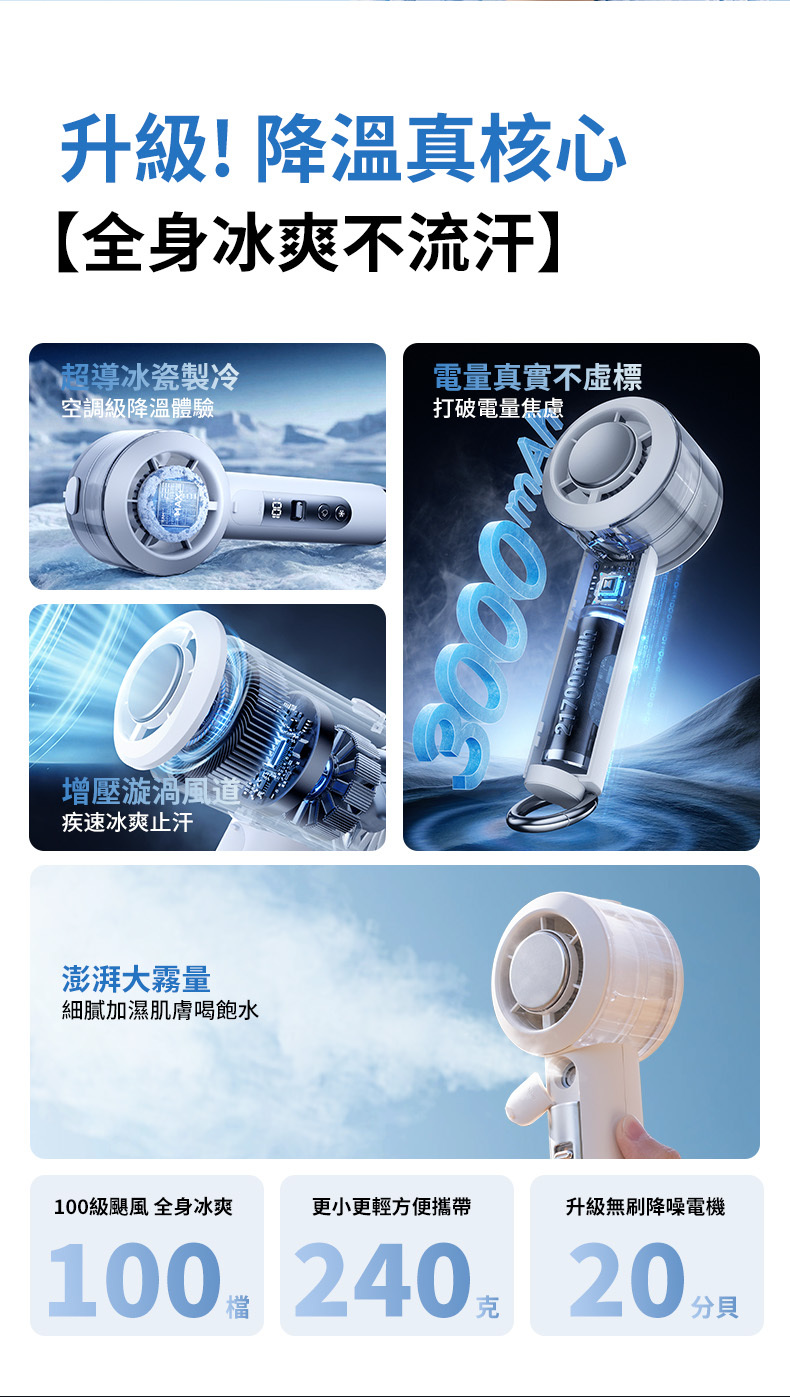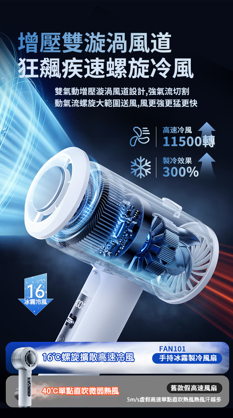 超導冰瓷製冷搭配奈米級噴霧,吹出體感 16°C 的冷凍風,降溫效果提升 300%!