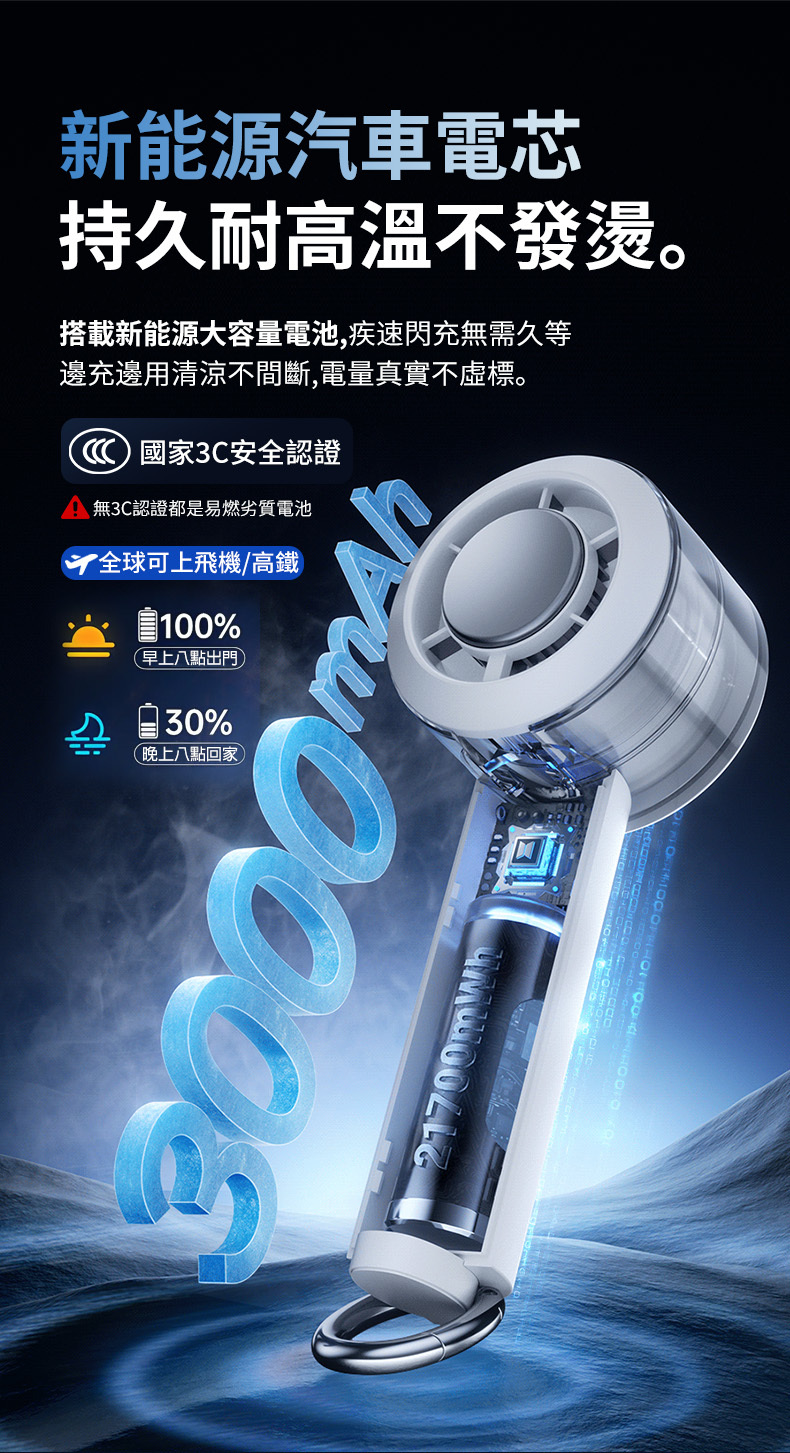 採用高效能動力電池,通過國家 3C 安全認證,長效續航、久吹不發燙,上飛機也安心。